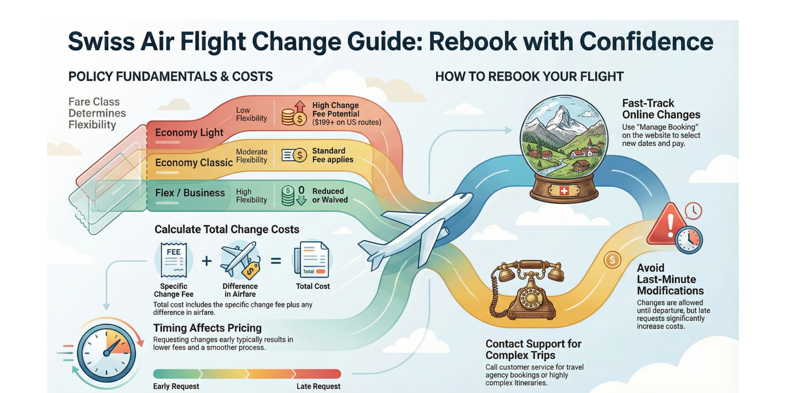 Some travelers make Swiss Air flight changes without losing focus or feeling worried. They don’t worry about what to do next. Last-minute travel disruptions affect all of us equally. It is their level of preparedness and understanding of policy that proves decisive. They do not allow flight date changes to indefinitely postpone their plans. We’ve discussed the essential points on how to change a Swiss Air flight without losing money, time, & peace of mind.
